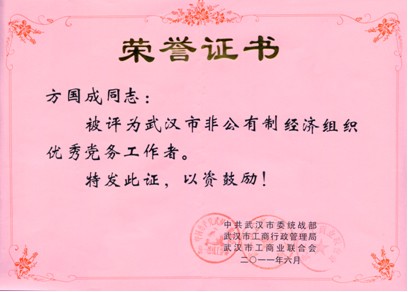 2011年6月,党委书记方国成同志被评为武汉市非公有制经济组织优秀党务工作者 2011-06-30   MORE