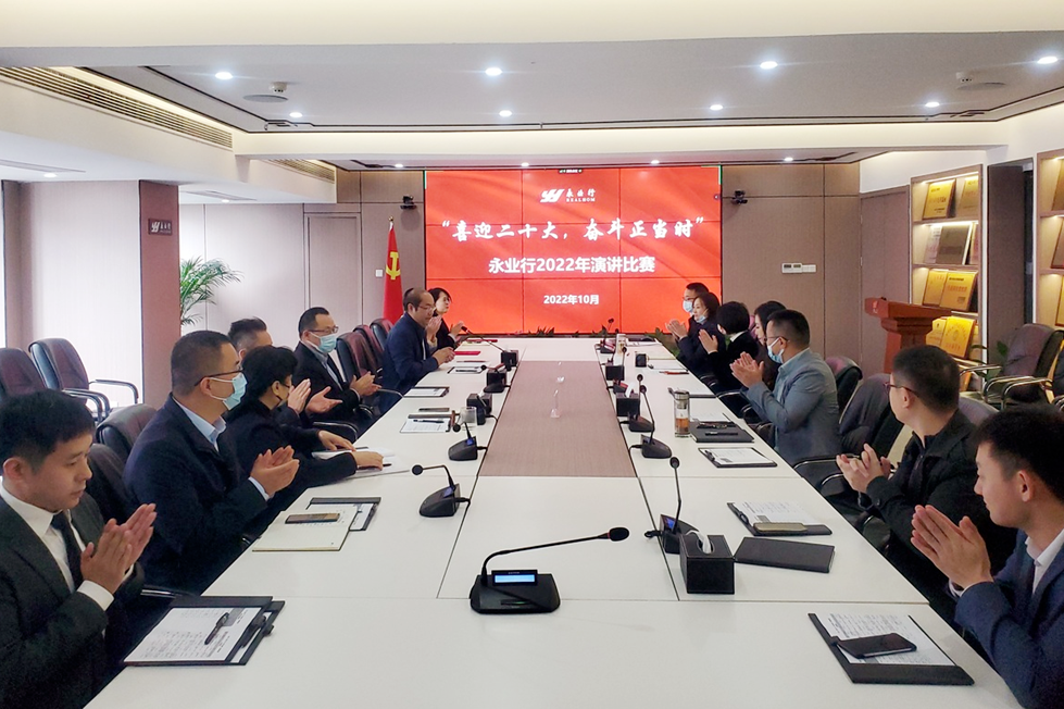 永业行举办“喜迎二十大 奋斗正当时”演讲比赛 2022-10-10 2022年10月10日,永业行“喜迎二十大,奋斗正当时”演讲比赛在总部会议室隆重举行。经过预赛选拔,9名来自总、分部的参赛选手同台竞技。永业行党委书记、董事长潘世炳,常务副总裁吴学锋,副总裁程为民,总部各职能部门负责人、分部优秀员工代表通过线上线下形式出席并担任评委。本次演讲比赛还特别邀请了党建指导员郭群到达现场观摩并指导工作。 在紧张有序的比赛现场,选手们紧扣演讲主题,上至家国情怀,下至企业和个人发展,谈体会、谈感悟,充分展现了广大员工积极向上、攻坚克难的精神面貌。他们声情并茂,或娓娓道来,或慷慨激昂,富有感染力的演讲赢得了现场阵阵掌声。 MORE