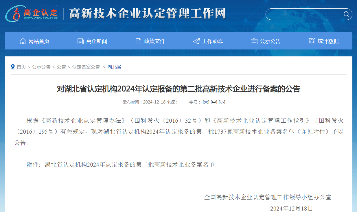 近日,全国高新技术企业认定管理工作领导小组办公室公布了湖北省2024年第二批国家高新技术企业备案名单,永业行工程项目管理有限公司通过认定。截至目前,永业行成员机构中已有四家获评国家高新技术企业。
